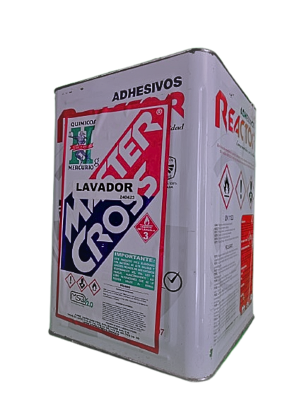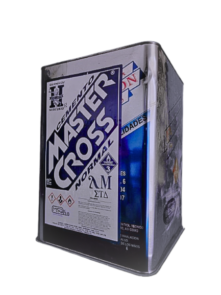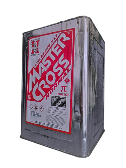 Lata de pegamento cemento Master Cross de 15 litros empleado en el pegado de partes del calzado.